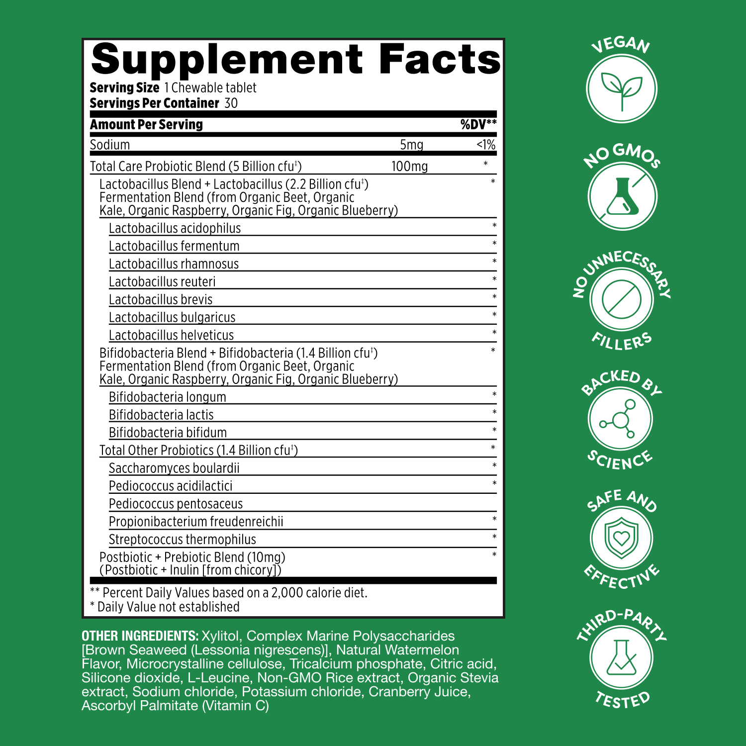 • 5 billion cfu (including probiotics derived from fermented fruits & veggies) per chewable tablet