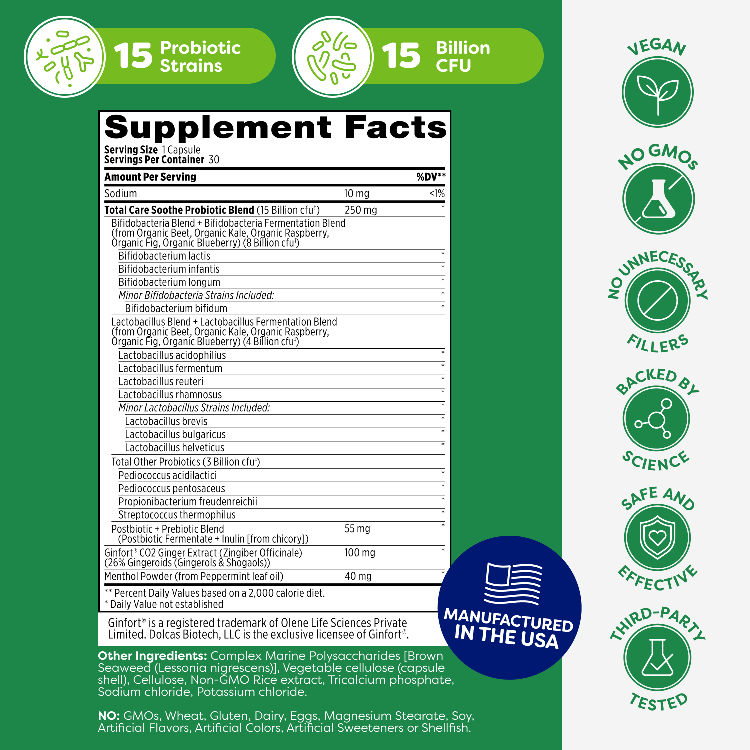 Probiotics + Ginger + Peppermint = The Ultimate Soothing Support.* Our Total Care Soothe Probiotic is a 15-strain, 15-billion CFU probiotic blend, derived in part from fermented fruits and vegetables, that features 100 mg of Ginfort® concentrated Ginger Extract and 40 mg Menthol Powder (from Peppermint leaf oil).